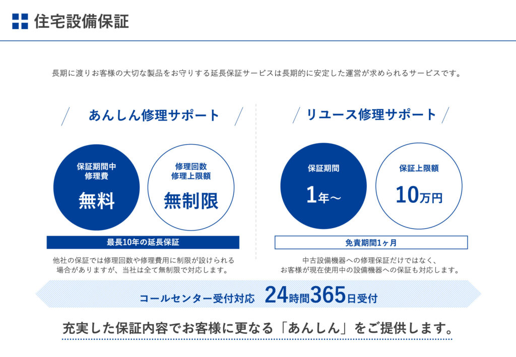 また当社の住宅設備保証は、コールセンターで24時間365日受付ております。お客様の快適な暮らしのため、サポートいたしますので、是非ご利用ください。